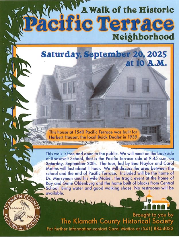 This walk is free and open to the public. We will meet on the backside of Roosevelt School, that is the Pacific Terrace side at 9:45 A.M. on Saturday, September 20th. The tour, led by Bea Naylor and Carol Mattos will last one hour. We will discuss the area between the school and the end of Pacific Terrace. Included will be the home of Dr. Merryman and his wife Mable, the tragic event in the home of Ray and Gene Oldenburg and the built of blocks from Central School. Bring water and good walking shoes. No restrooms will be available.