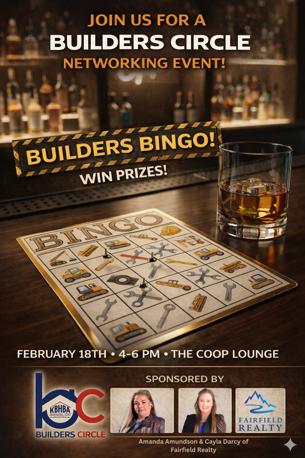 This month’s Builders Circle features Builders Bingo, a construction-themed game hosted by our event sponsors Amanda Amundson & Cayla Darcy of Fairfield Realty with prizes up for grabs. Grab a drink, play along, and network with fellow industry pros in a relaxed, no-pressure setting.