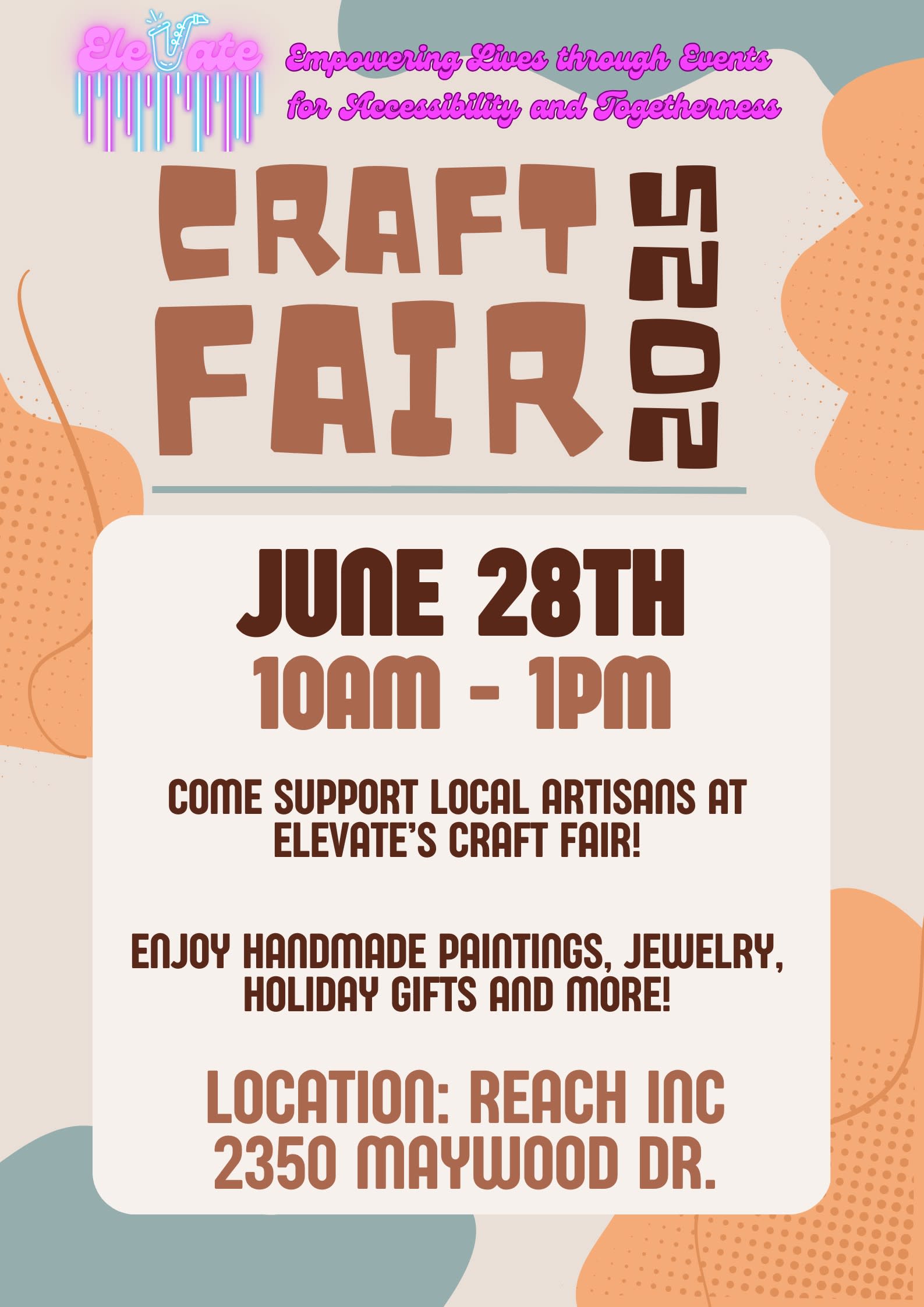 🎨✨ ELEVATE 2025 CRAFT FAIR! ✨🎨 You're invited to ELEVATE - Empowering Lives through Events, Accessibility, and Togetherness on Saturday, June 28th, from 10 AM – 1 PM for an inclusive community Craft Fair! 🧶 This special event celebrates the creativity and talents of individuals with Intellectual and Developmental Disabilities. Come support local artists and connect with an amazing community! Location: REACH INC. 250 Maywood Drive.Images