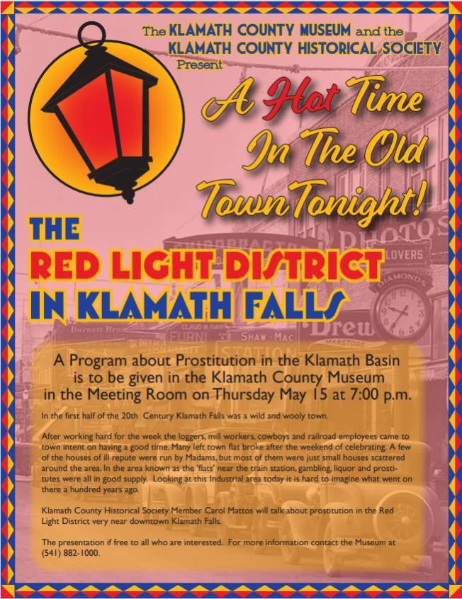 Klamath County Historical Society member Carol Mattos will talk about prostitution in the Red Light District very near downtown Klamath Falls.