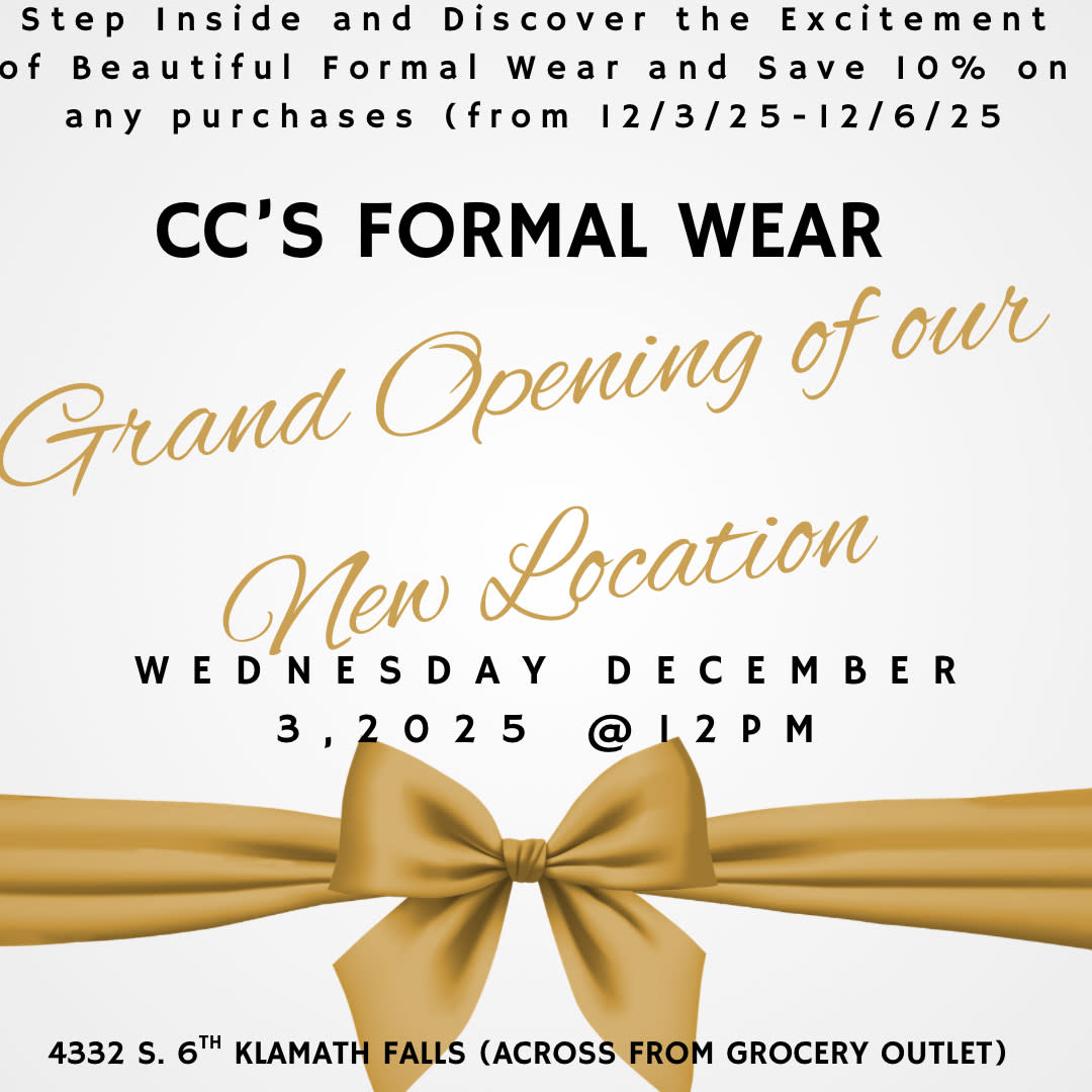 Let's celebrate the new location of CC's Chic Couture Formal Wear with a ribbon cutting! Ribbon cutting will be held at 12 pm! Grand opening celebration sale of 10% on any purchases from 12/3/2025-12/6/2025.