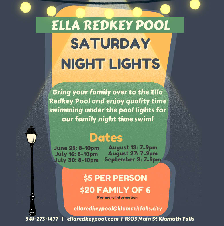 Bring your family over to the Ella Redkey Pool and enjoy quality time swimming under the pool lights for our family night time swim! Happening every other weekend starting Saturday, June 25 going until Saturday, September 3. $5 per person or $20 for a family of 6 or less. Register in advance at https://secure.rec1.com/OR/klamath-or/catalog