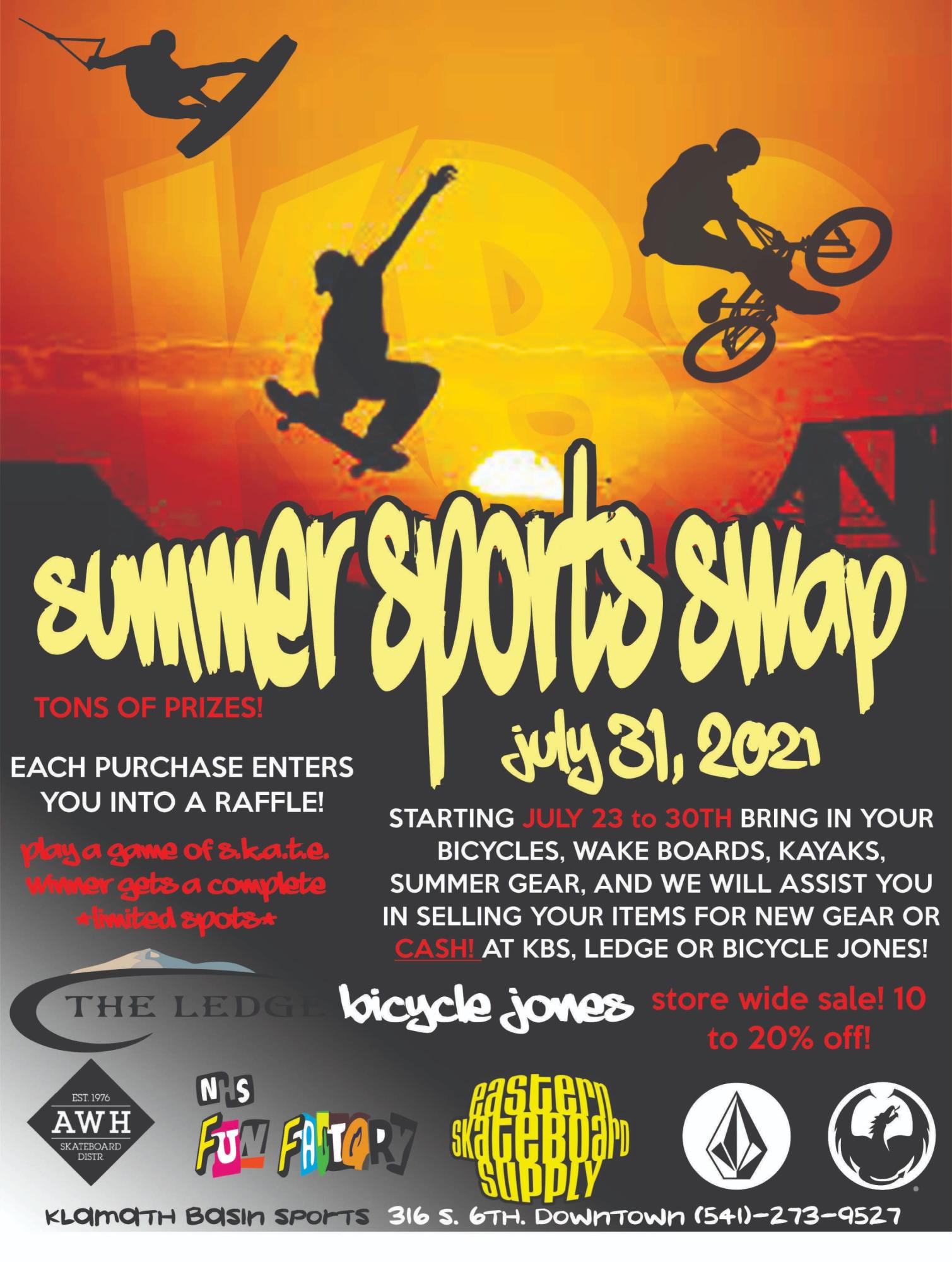 SATURDAY JULY 31st!! Summer Sports Swap! Klamath Basin Sports, The Ledge and Bicycle Jones are holding a Summer Sports Swap on Saturday, July 31st from 10am-5pm. Check out each location to see what we have to offer! Starting on July 23rd – July 30th, bring old/used summer gear for a chance to turn it into cash or store credit! Join us on Saturday July 31st for a great event with tons of prizes! We will also be hosting a game of S.K.A.T.E from 12pm - 2pm. Limited spots available. *All social distancing guidelines will be followed!