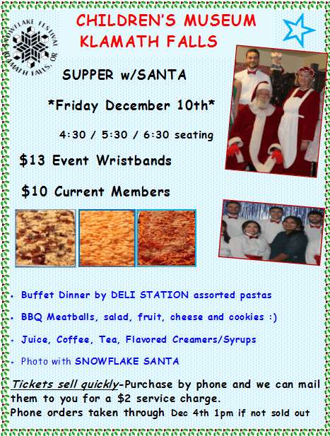 Have supper with Santa! Buffet dinner by Deli Station with assorted pastas, BBQ meatballs, salad, fruit, cheeses, and cookies. Juice, coffee, tea, and flavored creamers/syrups will be offered as beverages. Get your picture taken with Santa! 4:30 / 5:30 / 6:30 Seating Times Available $13 Event Wristbands / $10 for Current Members Tickets sell quickly! Purchase by phone and they can be mailed to you for a $2 service charge. Phone orders taken through December 4th at 1 PM, if not sold out.Images