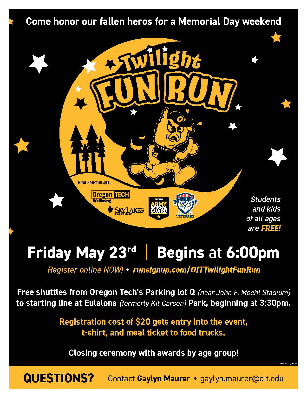 Free shuttles from Oregon Tech’s John F. Moehl Stadium to the starting line at Eulalona Park begin at 3:30 p.m. Please visit https://runsignup.com/OITTwilightFunRun to sign up or volunteer for the run.