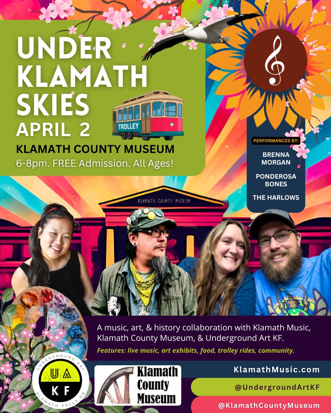 Klamath Music, the Klamath County Museum, and Underground Art KF are proud to announce the return of “Under Klamath Skies,” a beloved series of community cultural evenings, with two events scheduled for April 2 and October 1, 2026.